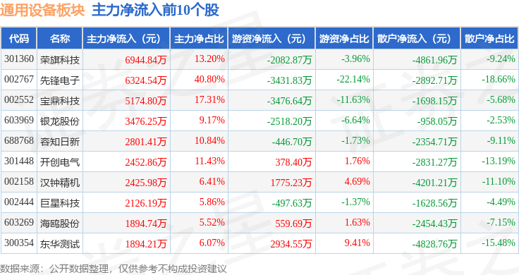 从资金流向上来看,当日通用设备板块主力资金净流出33.09亿元,游资资金净流入1.74亿元,散户资金净流入31.35亿元。通用设备板块个股资金流向见下表: