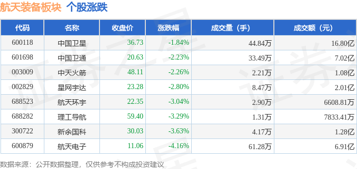 证券之星消息,10月17日航天装备板块较上一交易日下跌2.62%,航天电子领跌。当日上证指数报收于3839.76,下跌1.95%。深证成指报收于12688.94,下跌3.04%。航天装备板块个股涨跌见下表:
