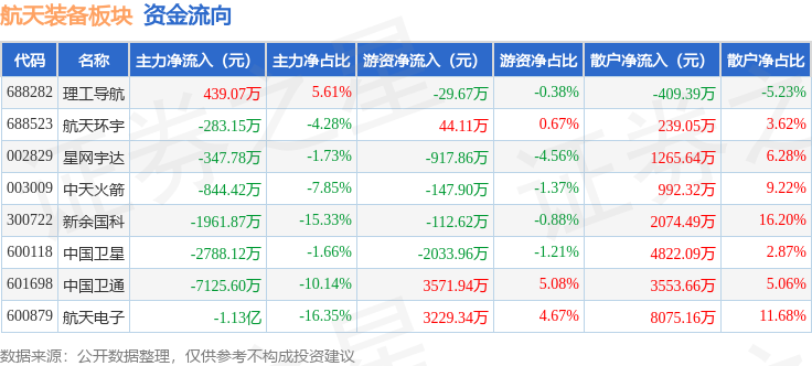 从资金流向上来看,当日航天装备板块主力资金净流出2.42亿元,游资资金净流入3603.37万元,散户资金净流入2.06亿元。航天装备板块个股资金流向见下表: