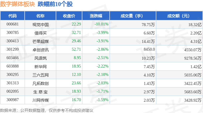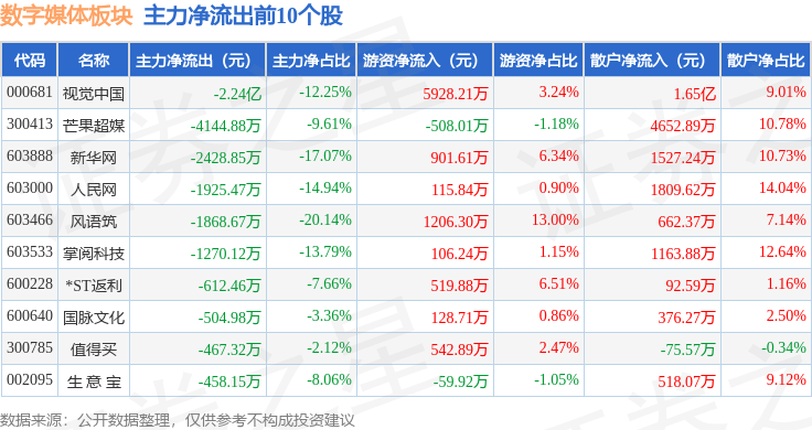 从资金流向上来看,当日数字媒体板块主力资金净流出3.72亿元,游资资金净流入9231.28万元,散户资金净流入2.8亿元。数字媒体板块个股资金流向见下表: