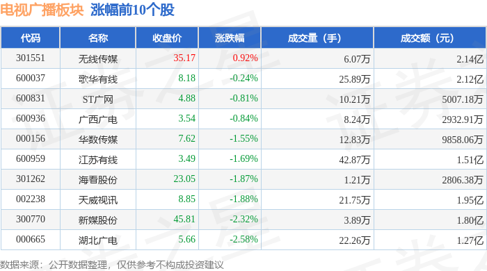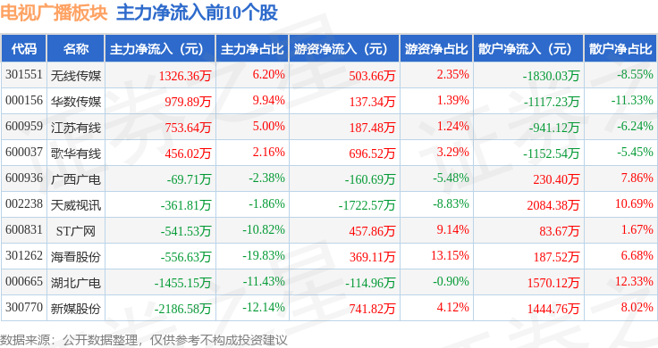 从资金流向上来看,当日电视广播板块主力资金净流出2.76亿元,游资资金净流出4047.76万元,散户资金净流入3.16亿元。电视广播板块个股资金流向见下表: