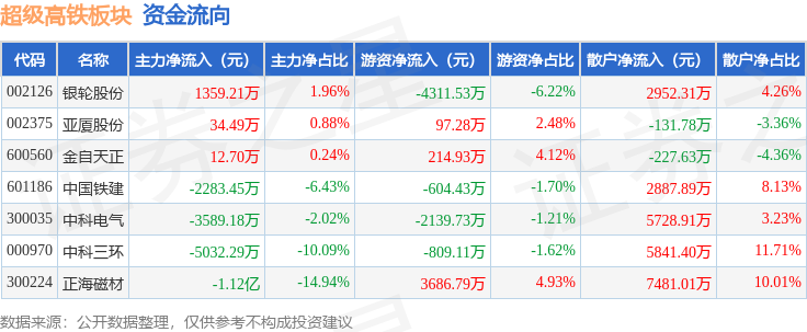 从资金流向上来看,当日超级高铁板块主力资金净流出2.07亿元,游资资金净流出3865.8万元,散户资金净流入2.45亿元。超级高铁板块个股资金流向见下表:
