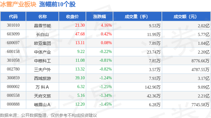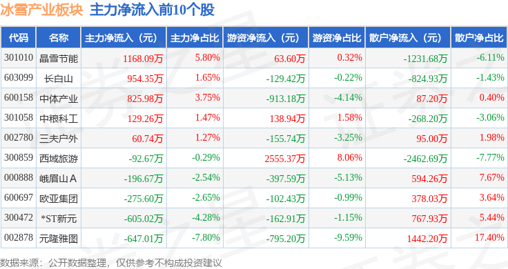 从资金流向上来看,当日冰雪产业板块主力资金净流出2.29亿元,游资资金净流出6006.96万元,散户资金净流入2.89亿元。冰雪产业板块个股资金流向见下表: