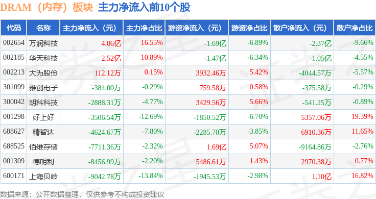 从资金流向上来看,当日DRAM(内存)板块主力资金净流出47.21亿元,游资资金净流入13.09亿元,散户资金净流入34.12亿元。DRAM(内存)板块个股资金流向见下表: