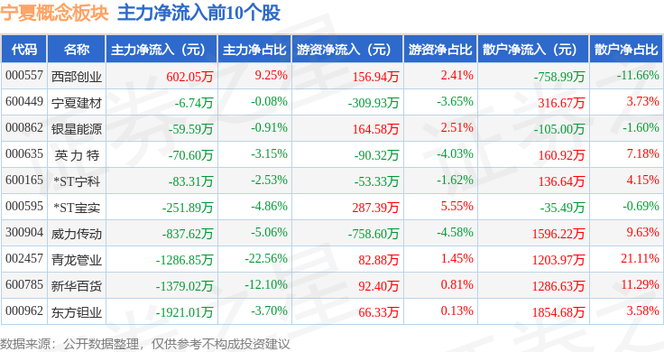 从资金流向上来看,当日宁夏概念板块主力资金净流出2.34亿元,游资资金净流入353.34万元,散户资金净流入2.31亿元。宁夏概念板块个股资金流向见下表: