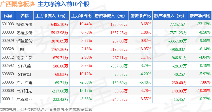 从资金流向上来看,当日广西概念板块主力资金净流出1.81亿元,游资资金净流入7928.18万元,散户资金净流入1.02亿元。广西概念板块个股资金流向见下表: