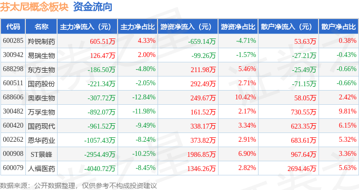 从资金流向上来看,当日芬太尼概念板块主力资金净流出9889.81万元,游资资金净流入4202.36万元,散户资金净流入5687.46万元。芬太尼概念板块个股资金流向见下表: