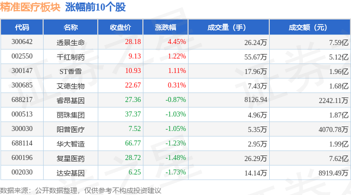 证券之星消息,10月17日精准医疗板块较上一交易日下跌2.96%,药明康德领跌。当日上证指数报收于3839.76,下跌1.95%。深证成指报收于12688.94,下跌3.04%。精准医疗板块个股涨跌见下表: