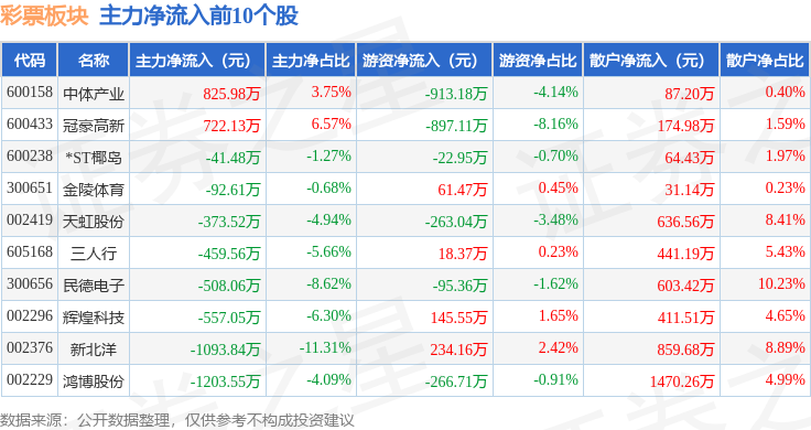 从资金流向上来看,当日彩票板块主力资金净流出1.91亿元,游资资金净流入2225.68万元,散户资金净流入1.68亿元。彩票板块个股资金流向见下表: