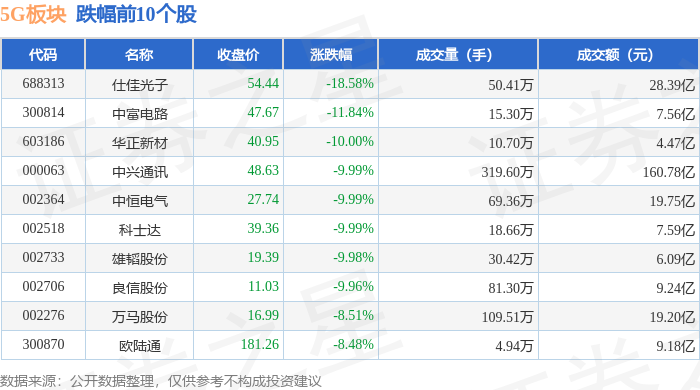证券之星消息,10月17日5G板块较上一交易日下跌3.42%,仕佳光子领跌。当日上证指数报收于3839.76,下跌1.95%。深证成指报收于12688.94,下跌3.04%。5G板块个股涨跌见下表: