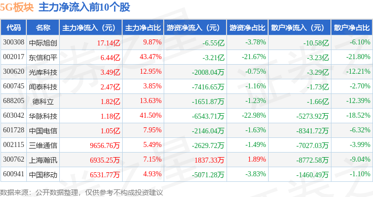 从资金流向上来看,当日5G板块主力资金净流出121.77亿元,游资资金净流入33.08亿元,散户资金净流入88.69亿元。5G板块个股资金流向见下表: