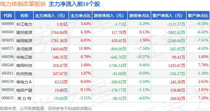 从资金流向上来看,当日电力体制改革板块主力资金净流出15.22亿元,游资资金净流入2325.2万元,散户资金净流入14.99亿元。电力体制改革板块个股资金流向见下表: