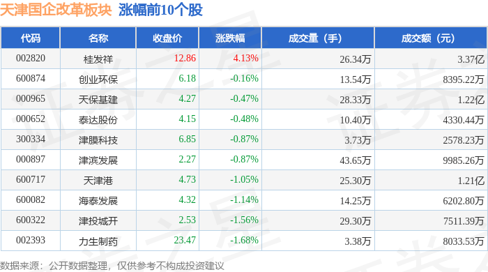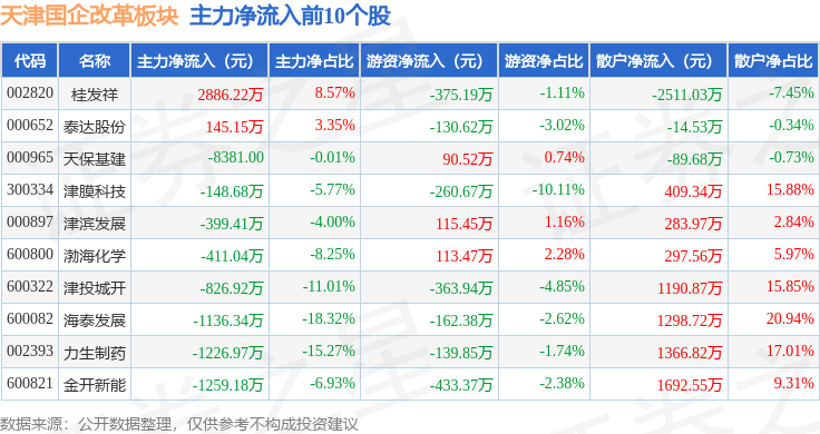 从资金流向上来看,当日天津国企改革板块主力资金净流出1.8亿元,游资资金净流出2349.44万元,散户资金净流入2.04亿元。天津国企改革板块个股资金流向见下表: