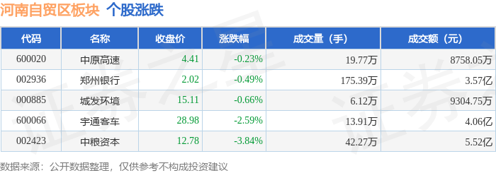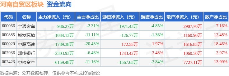 从资金流向上来看,当日河南自贸区板块主力资金净流出1.22亿元,游资资金净流出2249.85万元,散户资金净流入1.45亿元。河南自贸区板块个股资金流向见下表: