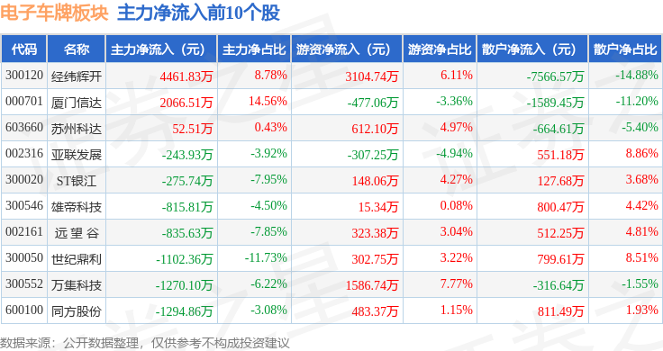 从资金流向上来看,当日电子车牌板块主力资金净流出2.3亿元,游资资金净流入1.06亿元,散户资金净流入1.24亿元。电子车牌板块个股资金流向见下表: