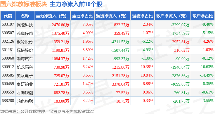 从资金流向上来看,当日国六排放标准板块主力资金净流出7.3亿元,游资资金净流入1.95亿元,散户资金净流入5.35亿元。国六排放标准板块个股资金流向见下表: