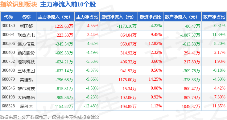 从资金流向上来看,当日指纹识别板块主力资金净流出19.72亿元,游资资金净流入5.15亿元,散户资金净流入14.57亿元。指纹识别板块个股资金流向见下表: