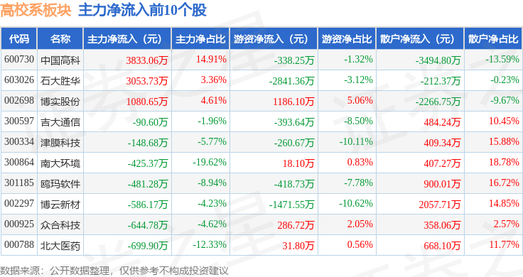 从资金流向上来看,当日高校系板块主力资金净流出13.28亿元,游资资金净流入3.83亿元,散户资金净流入9.45亿元。高校系板块个股资金流向见下表:
