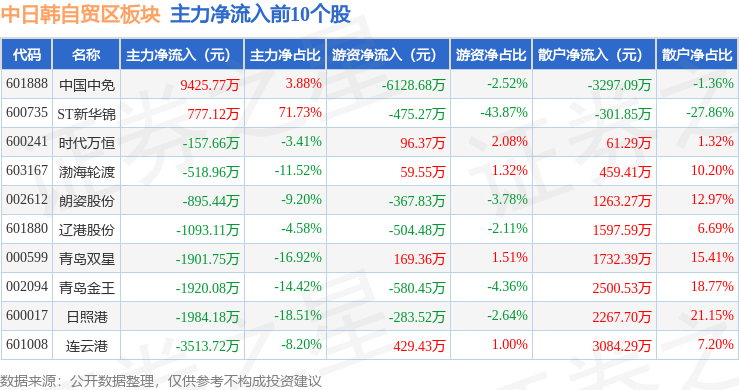 从资金流向上来看,当日中日韩自贸区板块主力资金净流出6872.23万元,游资资金净流出4611.78万元,散户资金净流入1.15亿元。中日韩自贸区板块个股资金流向见下表:
