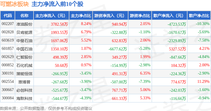 从资金流向上来看,当日可燃冰板块主力资金净流出7.15亿元,游资资金净流入2.23亿元,散户资金净流入4.92亿元。可燃冰板块个股资金流向见下表: