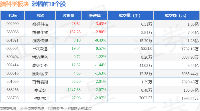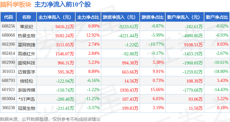 从资金流向上来看,当日脑科学板块主力资金净流出22.75亿元,游资资金净流入3.74亿元,散户资金净流入19.01亿元。脑科学板块个股资金流向见下表: