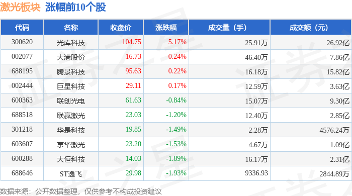 从资金流向上来看,当日激光板块主力资金净流出16.17亿元,游资资金净流入5.38亿元,散户资金净流入10.79亿元。激光板块个股资金流向见下表: