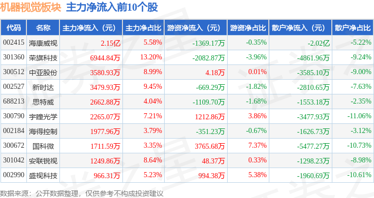 从资金流向上来看,当日机器视觉板块主力资金净流出34.52亿元,游资资金净流入6.41亿元,散户资金净流入28.11亿元。机器视觉板块个股资金流向见下表: