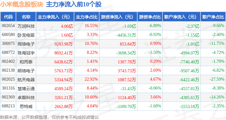 从资金流向上来看,当日小米概念股板块主力资金净流出95.22亿元,游资资金净流入23.83亿元,散户资金净流入71.4亿元。小米概念股板块个股资金流向见下表: