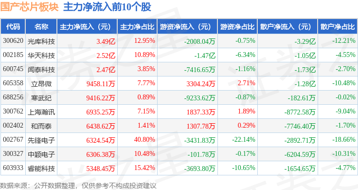 从资金流向上来看,当日国产芯片板块主力资金净流出258.59亿元,游资资金净流入88.79亿元,散户资金净流入169.8亿元。国产芯片板块个股资金流向见下表: