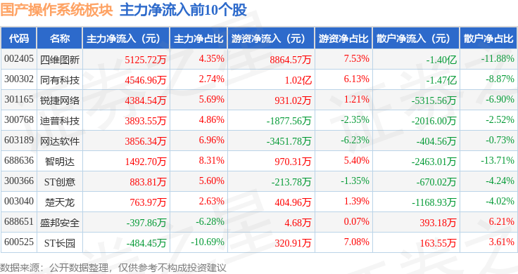 从资金流向上来看,当日国产操作系统板块主力资金净流出43.0亿元,游资资金净流入17.53亿元,散户资金净流入25.47亿元。国产操作系统板块个股资金流向见下表: