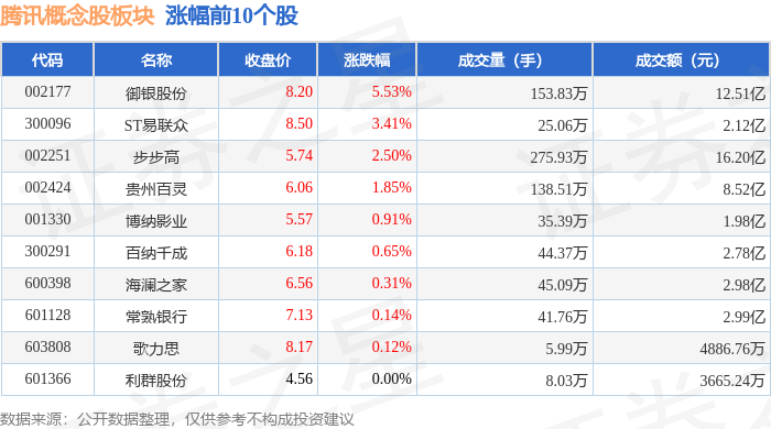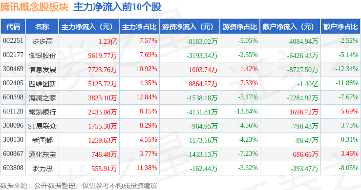 从资金流向上来看,当日腾讯概念股板块主力资金净流出56.71亿元,游资资金净流入14.31亿元,散户资金净流入42.39亿元。腾讯概念股板块个股资金流向见下表: