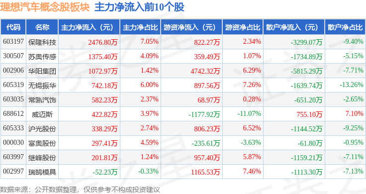 从资金流向上来看,当日理想汽车概念股板块主力资金净流出20.0亿元,游资资金净流入3.58亿元,散户资金净流入16.41亿元。理想汽车概念股板块个股资金流向见下表: