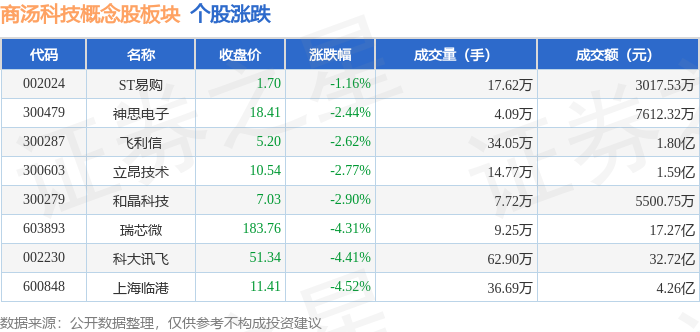 证券之星消息,10月17日商汤科技概念股板块较上一交易日下跌4.07%,上海临港领跌。当日上证指数报收于3839.76,下跌1.95%。深证成指报收于12688.94,下跌3.04%。商汤科技概念股板块个股涨跌见下表: