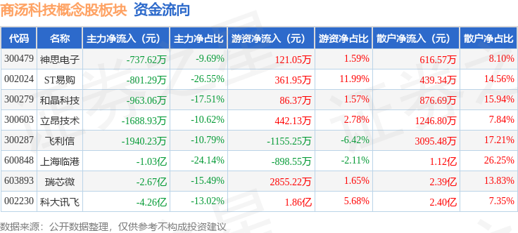 从资金流向上来看,当日商汤科技概念股板块主力资金净流出8.58亿元,游资资金净流入2.04亿元,散户资金净流入6.54亿元。商汤科技概念股板块个股资金流向见下表: