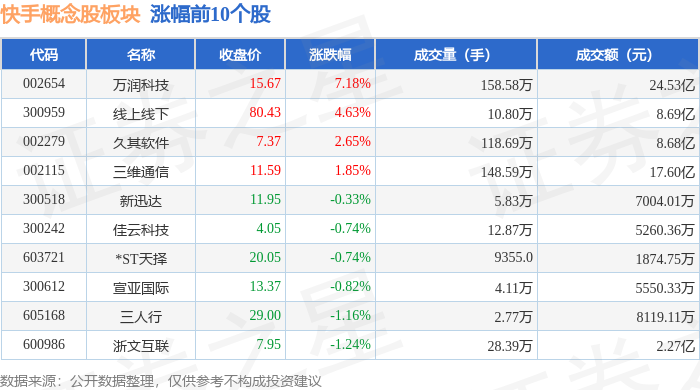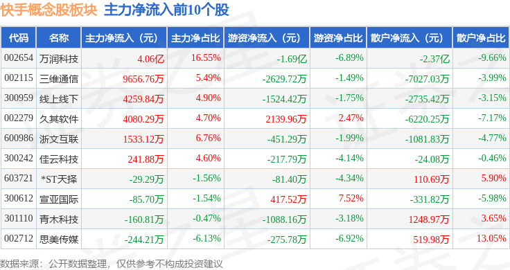 从资金流向上来看,当日快手概念股板块主力资金净流出7.89亿元,游资资金净流出9183.26万元,散户资金净流入8.81亿元。快手概念股板块个股资金流向见下表:
