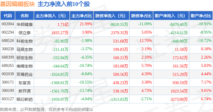 从资金流向上来看,当日基因编辑板块主力资金净流入3111.77万元,游资资金净流出1996.25万元,散户资金净流出1115.52万元。基因编辑板块个股资金流向见下表: