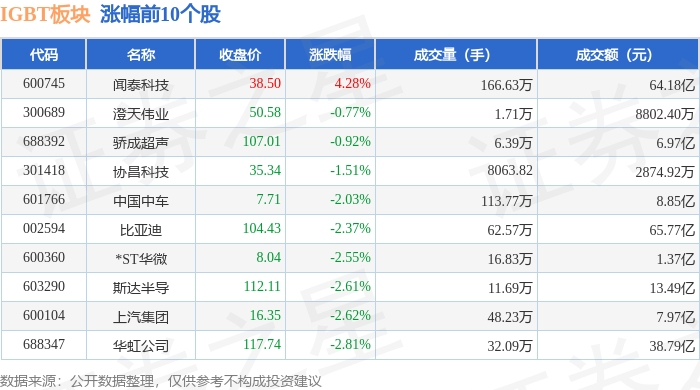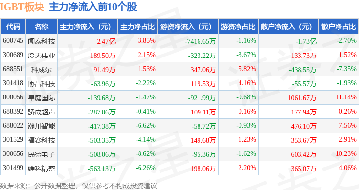 从资金流向上来看,当日IGBT板块主力资金净流出63.98亿元,游资资金净流入18.78亿元,散户资金净流入45.2亿元。IGBT板块个股资金流向见下表: