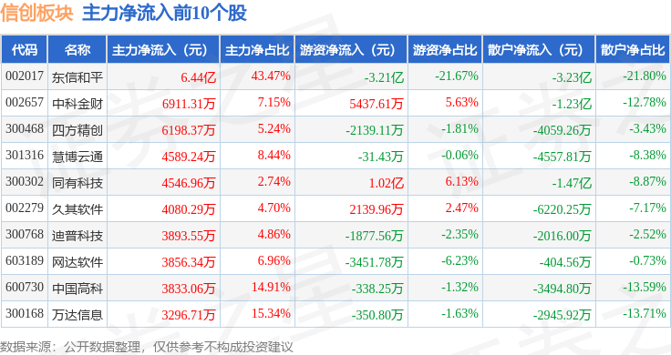 从资金流向上来看,当日信创板块主力资金净流出64.56亿元,游资资金净流入14.92亿元,散户资金净流入49.65亿元。信创板块个股资金流向见下表: