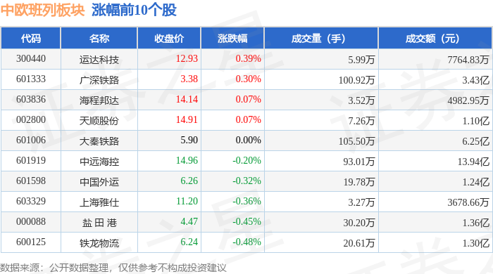 从资金流向上来看,当日中欧班列板块主力资金净流出3.52亿元,游资资金净流入7897.14万元,散户资金净流入2.73亿元。中欧班列板块个股资金流向见下表: