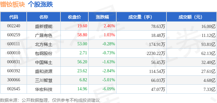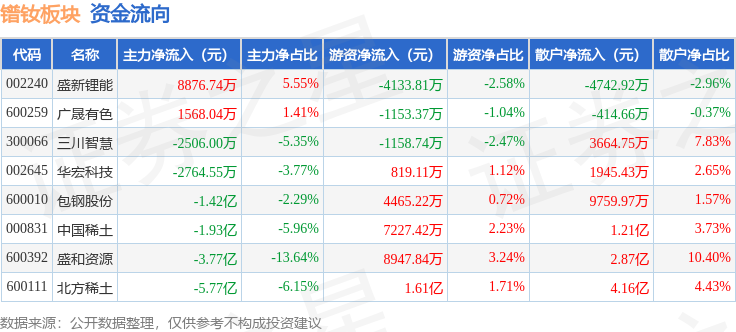 从资金流向上来看,当日镨钕板块主力资金净流出12.37亿元,游资资金净流入3.11亿元,散户资金净流入9.26亿元。镨钕板块个股资金流向见下表: