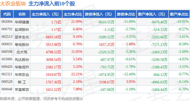 从资金流向上来看,当日大农业板块主力资金净流出21.45亿元,游资资金净流入1.23亿元,散户资金净流入20.22亿元。大农业板块个股资金流向见下表: