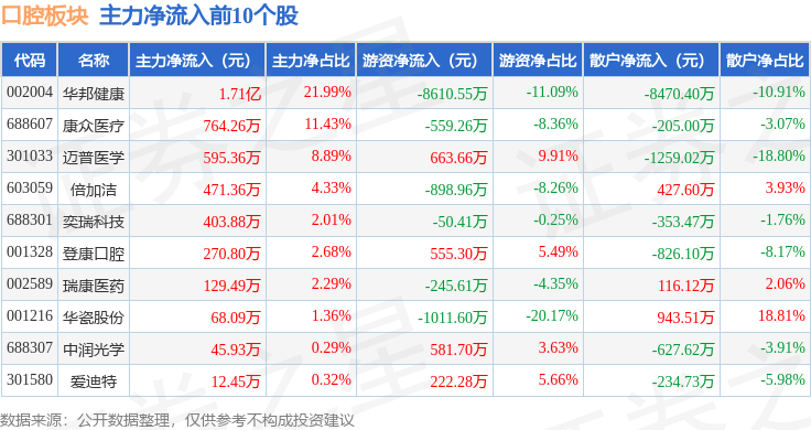 从资金流向上来看,当日口腔板块主力资金净流出8.78亿元,游资资金净流出5787.01万元,散户资金净流入9.36亿元。口腔板块个股资金流向见下表: