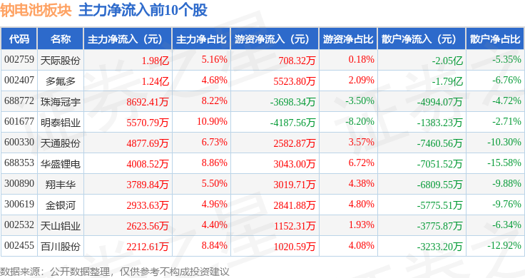 从资金流向上来看,当日钠电池板块主力资金净流出48.82亿元,游资资金净流入12.57亿元,散户资金净流入36.25亿元。钠电池板块个股资金流向见下表: