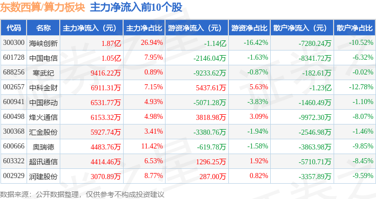 从资金流向上来看,当日东数西算/算力板块主力资金净流出104.23亿元,游资资金净流入27.59亿元,散户资金净流入76.64亿元。东数西算/算力板块个股资金流向见下表: