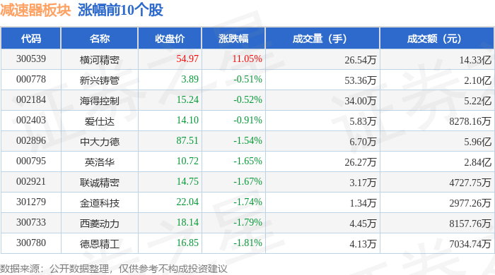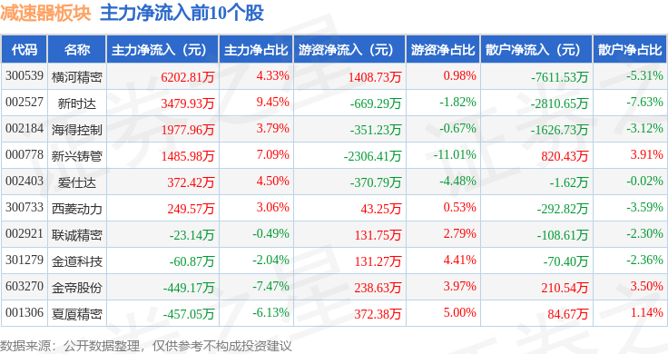 从资金流向上来看,当日减速器板块主力资金净流出23.38亿元,游资资金净流入4.88亿元,散户资金净流入18.49亿元。减速器板块个股资金流向见下表: