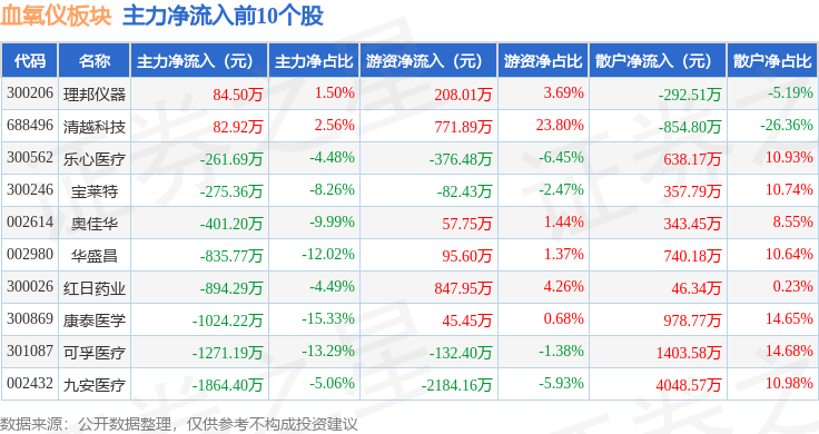 从资金流向上来看,当日血氧仪板块主力资金净流出2.62亿元,游资资金净流入6272.95万元,散户资金净流入1.99亿元。血氧仪板块个股资金流向见下表: