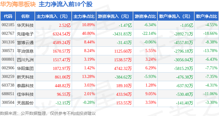 从资金流向上来看,当日华为海思板块主力资金净流出40.64亿元,游资资金净流入6.65亿元,散户资金净流入34.0亿元。华为海思板块个股资金流向见下表: