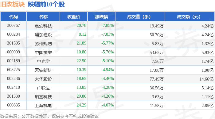 证券之星消息,10月17日旧改板块较上一交易日下跌1.56%,震安科技领跌。当日上证指数报收于3839.76,下跌1.95%。深证成指报收于12688.94,下跌3.04%。旧改板块个股涨跌见下表: