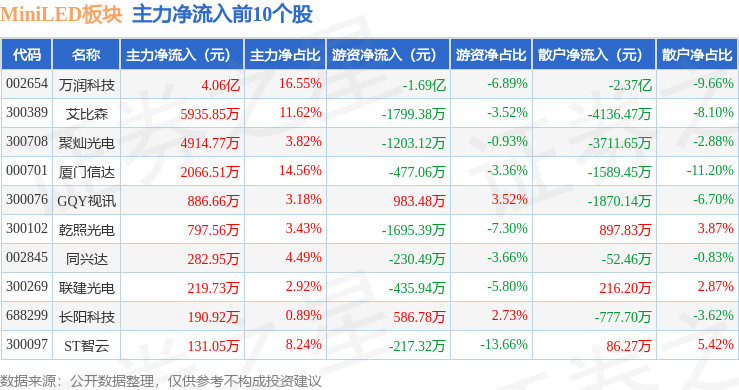 从资金流向上来看,当日MiniLED板块主力资金净流出27.21亿元,游资资金净流入4.43亿元,散户资金净流入22.78亿元。MiniLED板块个股资金流向见下表: