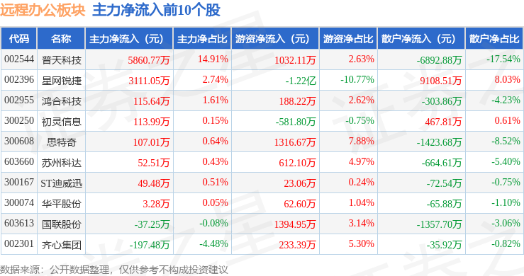 从资金流向上来看,当日远程办公板块主力资金净流出19.79亿元,游资资金净流入5.46亿元,散户资金净流入14.33亿元。远程办公板块个股资金流向见下表: